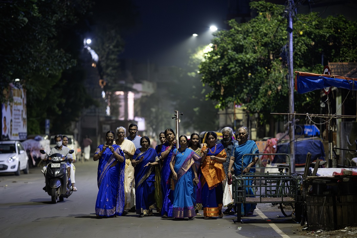 タミル暦マールガリ月の朝、チェンナイの名刹カパレーシュワラ寺院の周囲で行われる集団歌謡を見学。厳かな夜明け前の薄暗がりの中、響き渡る信仰心にあふれた歌声を体感。